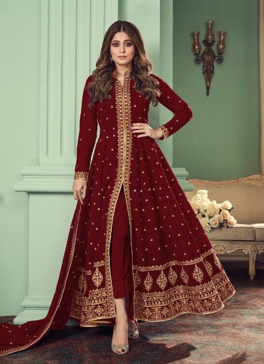 Buy Maroon Thread Embroidered Georgette Party Wear Slit Cut Suit Online In India Etsy